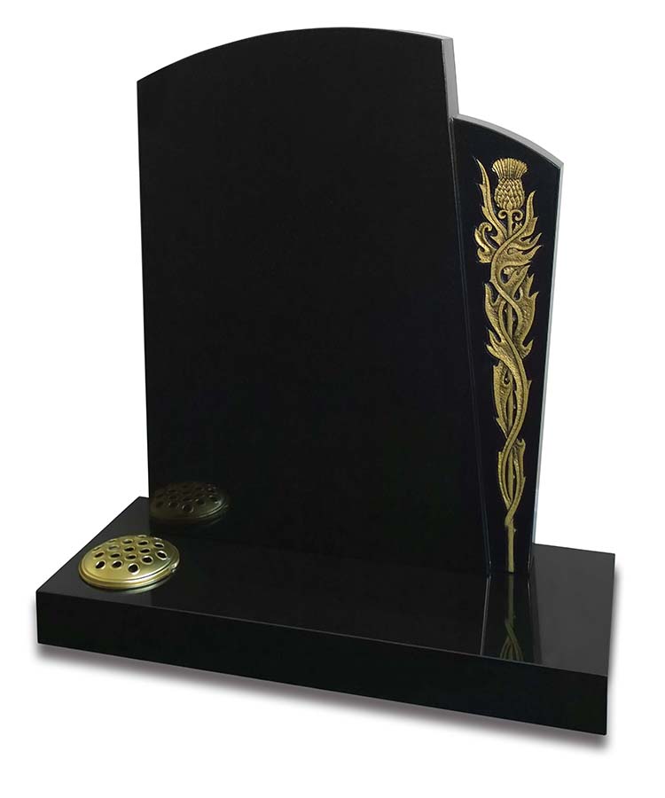 The Ayrshire Memorial is a gorgeously made polished black granite memorial with a beautifully detailed thistle engraving, which is finished off with a metallic finish for contrast.