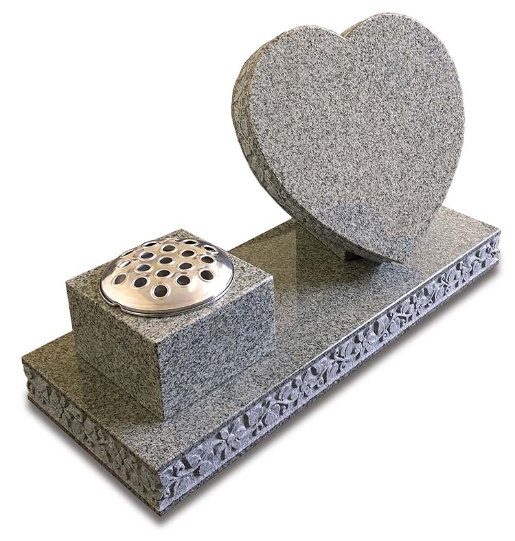 This dual purpose memorial features a gorgeously carved karin grey granite heart alongside a block vase memorial on the same base. Along the edges of the base and the heart is a beautifully cared floral pattern for added beauty.